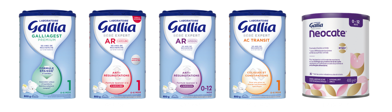 ° DADFMS : denrée alimentaire destinée à des fins médicales spéciales. À utiliser sous contrôle médical. Jusqu’à 6 mois, cet aliment est la seule source d’alimentation de votre nourrisson. - ◊APLV : Allergie aux protéines de lait de vache 1. peut nécessité l’utilisation d’une tétine adaptée– 2. Observatoire ADAN. Approche de première intention des troubles digestifs mineurs associés du nourrisson de moins de 6 mois. Médecine & Enfance. 2014;34. Amélioration après 1 mois de consommation. Etude sur Galliagest Premium sans prébiotiques – 3.Salvatore S, et al. Tolerance and Safety of an Anti-Regurgitation Formula Containing Locust Bean Gum, Pre-, and Postbiotics: A Multi-Country Multi-Center Prospective Randomized Controlled Study in Infants with Regurgitation. Nutrients. 2024;16(6):899. 4. Bellaiche M, et al. Digestive Tolerance and Safety of an Anti-Regurgitation Formula Containing Locust Bean Gum, Prebiotics and Postbiotics: A Real-World Study. Pediatr Gastroenterol Hepatol Nutr. 2023;26(5):249-265. – 5. 1. Ramirez-Mayans J, et al. Nutritional management of children with GER: a comparison of formulas. Int Pediat. 2003;18:78–8. 6. Horvath et al., The Effect of Thickened-Feed Interventions on Gastroesophageal Reflux in Infants: Systematic Review and Meta-analysis of Randomized, Controlled Trials. Pediatrics 2008;122:e1268–e1277 - 7. Meunier et al., Locust bean gum safety in neonates and young infants An integrated review of the toxicological database and clinical evidence. Regul Toxicol Pharmacol . 2014 Oct;70(1):155-69. - 8. Salvatore et al., Thickened infant formula : What to know? Nutrition 49 (2018) 51-56.