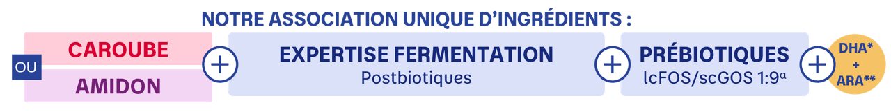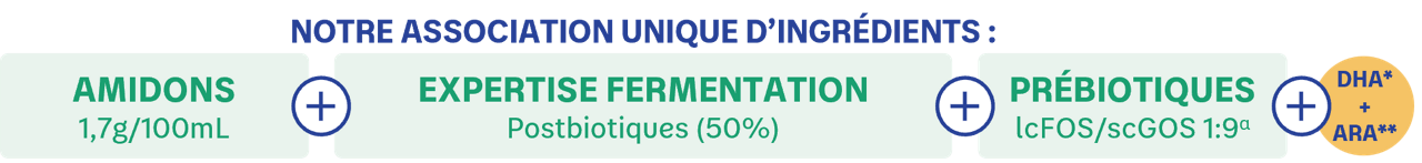 *DHA : acide docosahexaénoïque. Conformément à la réglementation sur la nutrition infantile. **ARA : acide arachidonique. αlcFOS/scGOS 1:9 : Fructo-oligosaccharides à chaîne longue et Galacto-oligosaccharides à chaîne courte, pour un rapport de 1 pour 9. - # Bénéfices observés sur les ingrédients présents dans Bébé Expert AR Amidon.