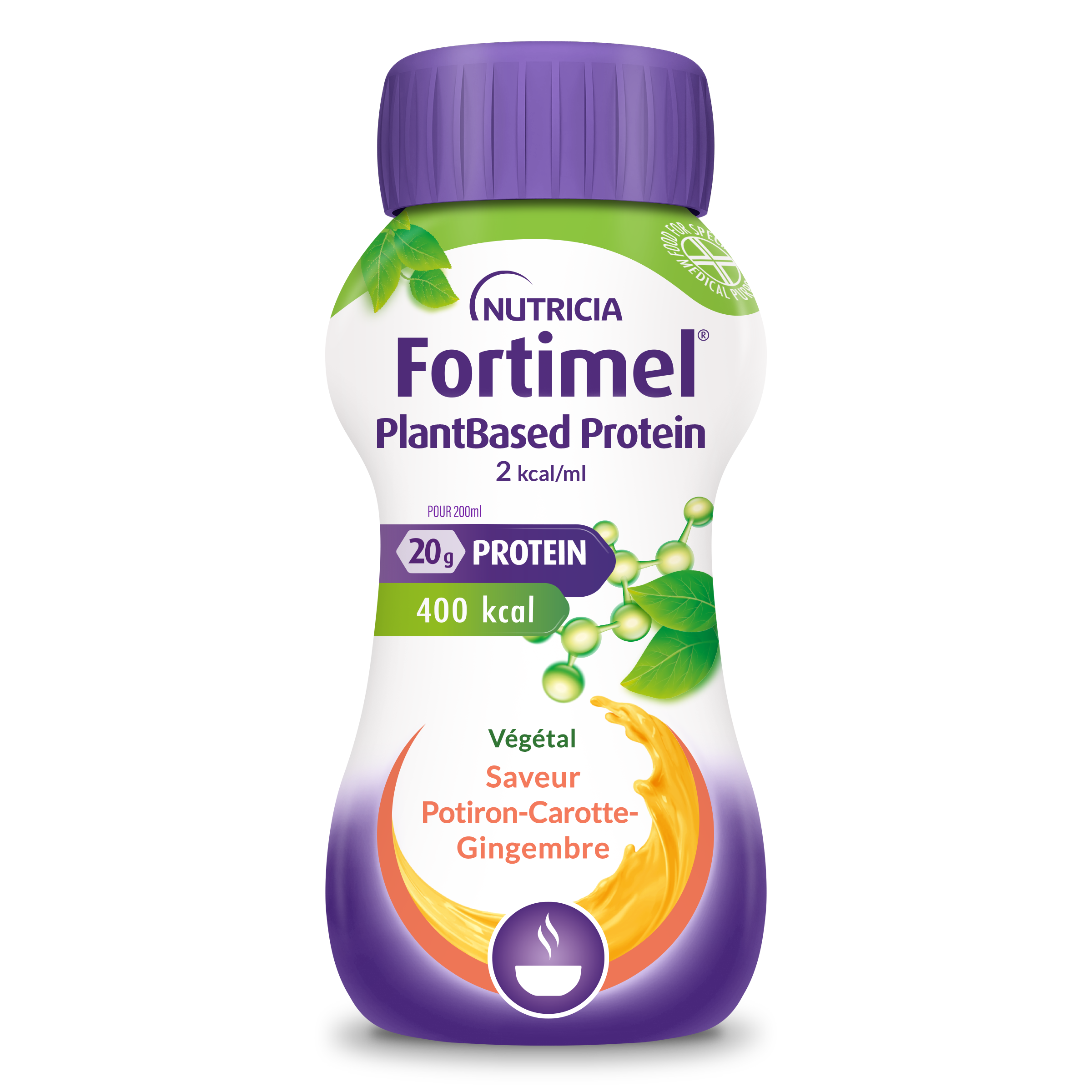 Fortimel® PlantBased Protein 2 kcal/ml est un complément nutritionnel oral hyperénergétique et hyperprotéiné, disponible en 4 saveurs dont 2 salées et 2 sucrées, à déguster chaude (en soupe, sans porter à ébullition) ou froide (en gaspacho). Convient aussi pour les végétaliens.