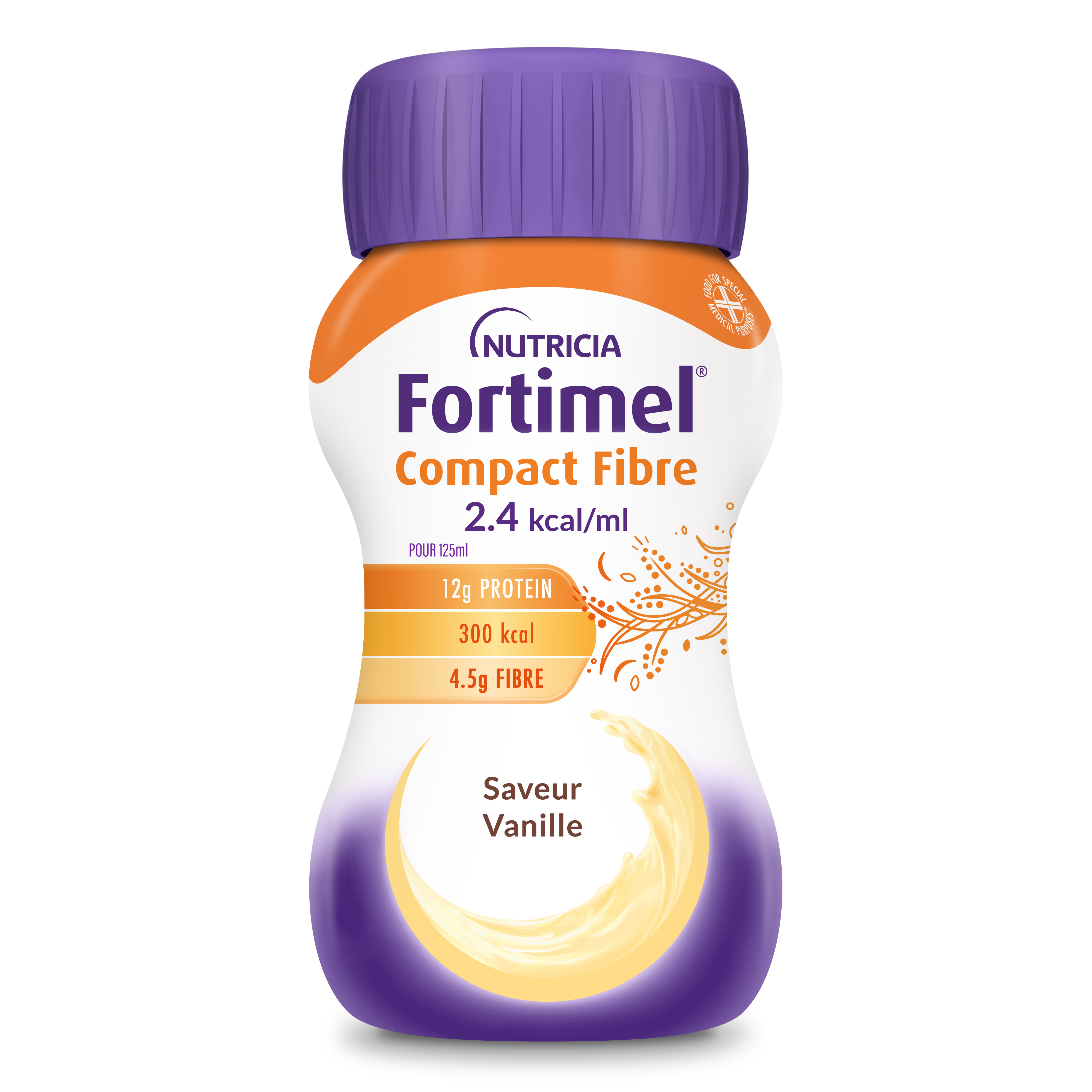 Pour les besoins nutritionnels en cas de dénutrition associée à une maladie. Fortimel® Compact Fibre 2.4 kcal/ml est un complément nutritionnel oral hyperénergétique et hyperprotéiné avec fibres, disponible en 3 saveurs différentes.